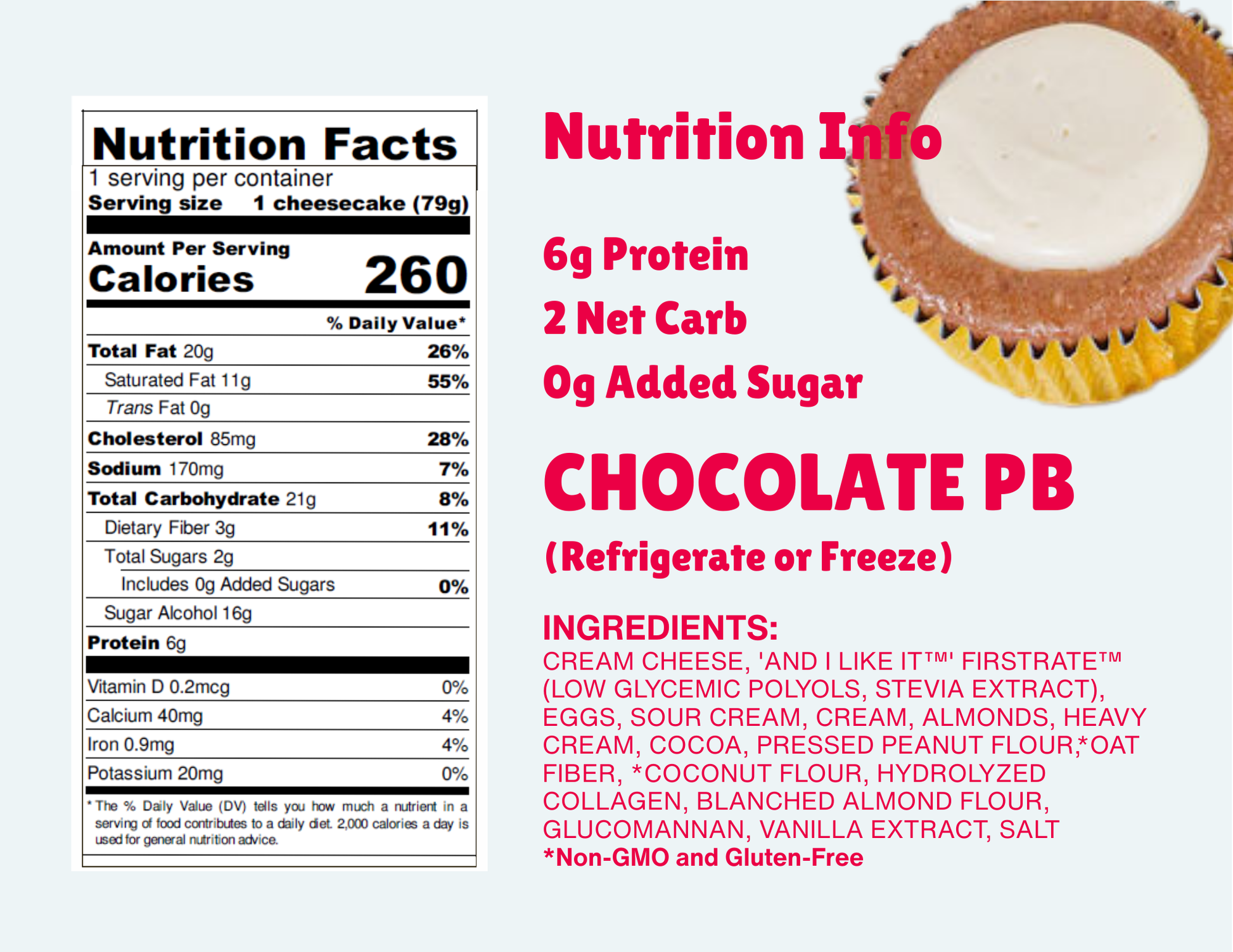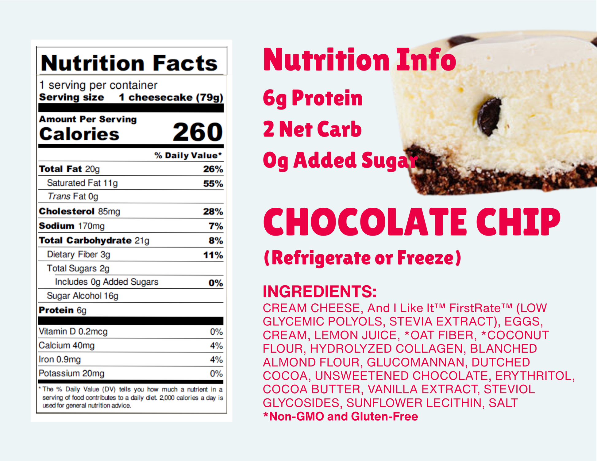 Sugar-free chips folded into our creamy batter on a chocolate GF crust -