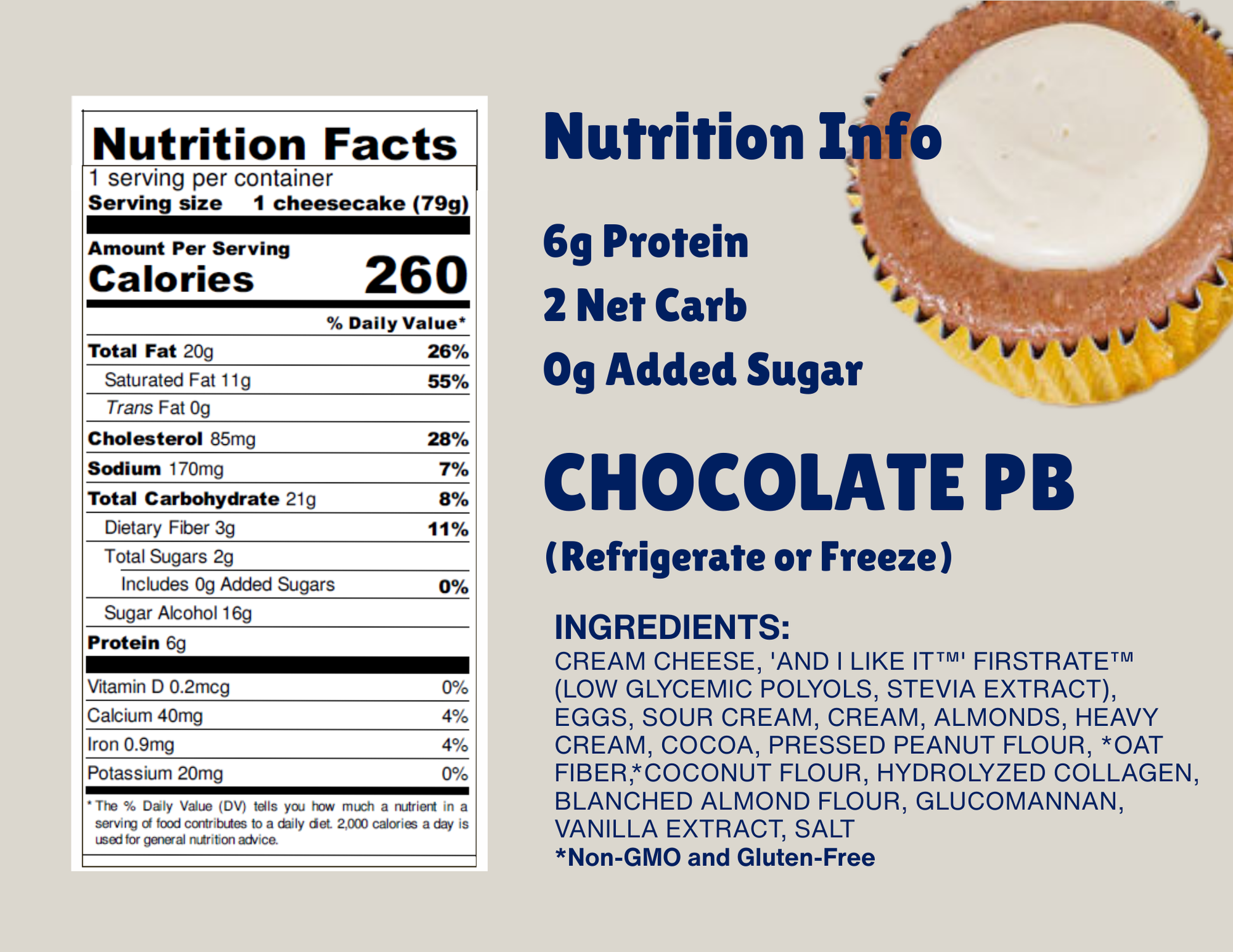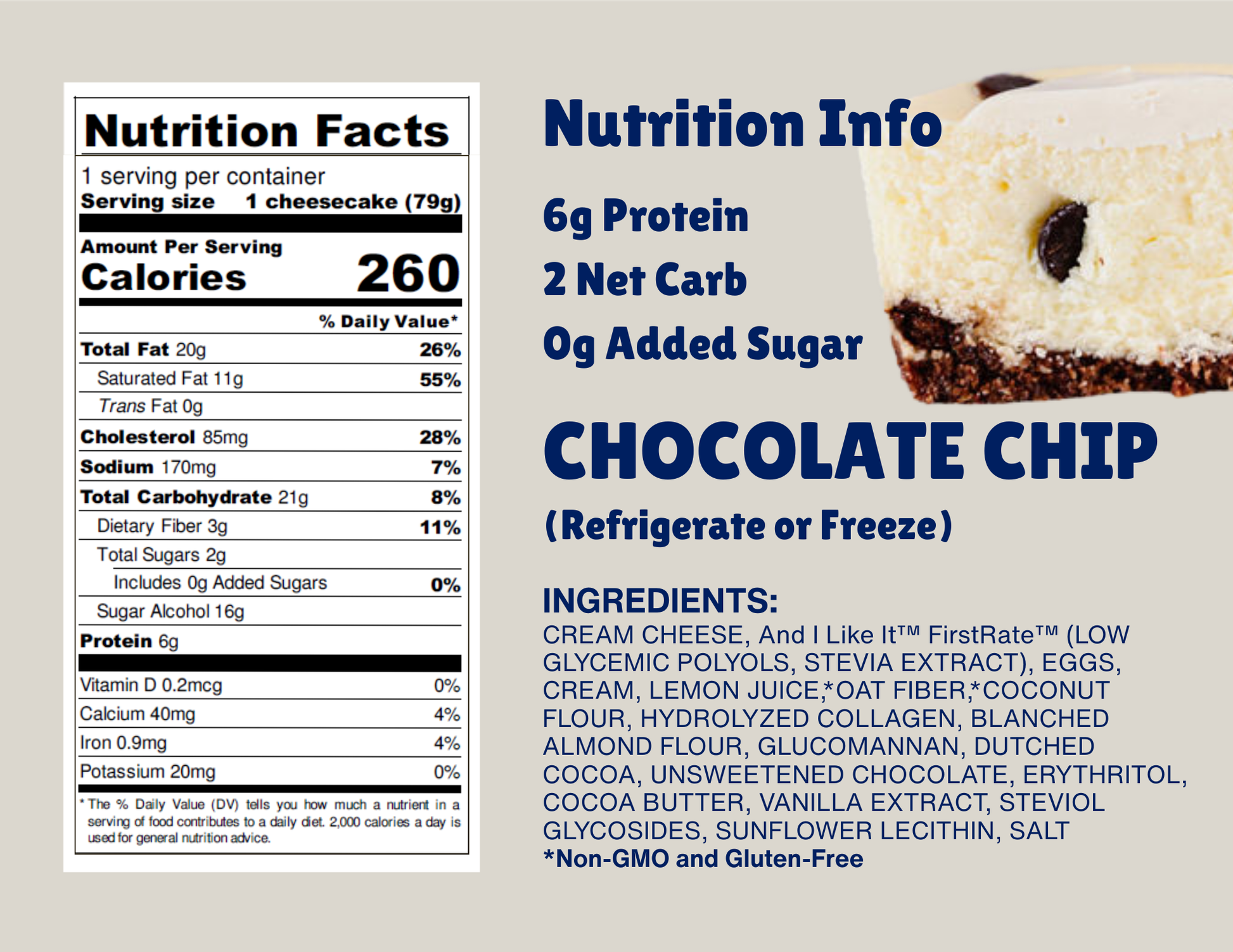 Sugar-free chips folded into our creamy batter on a chocolate GF crust -